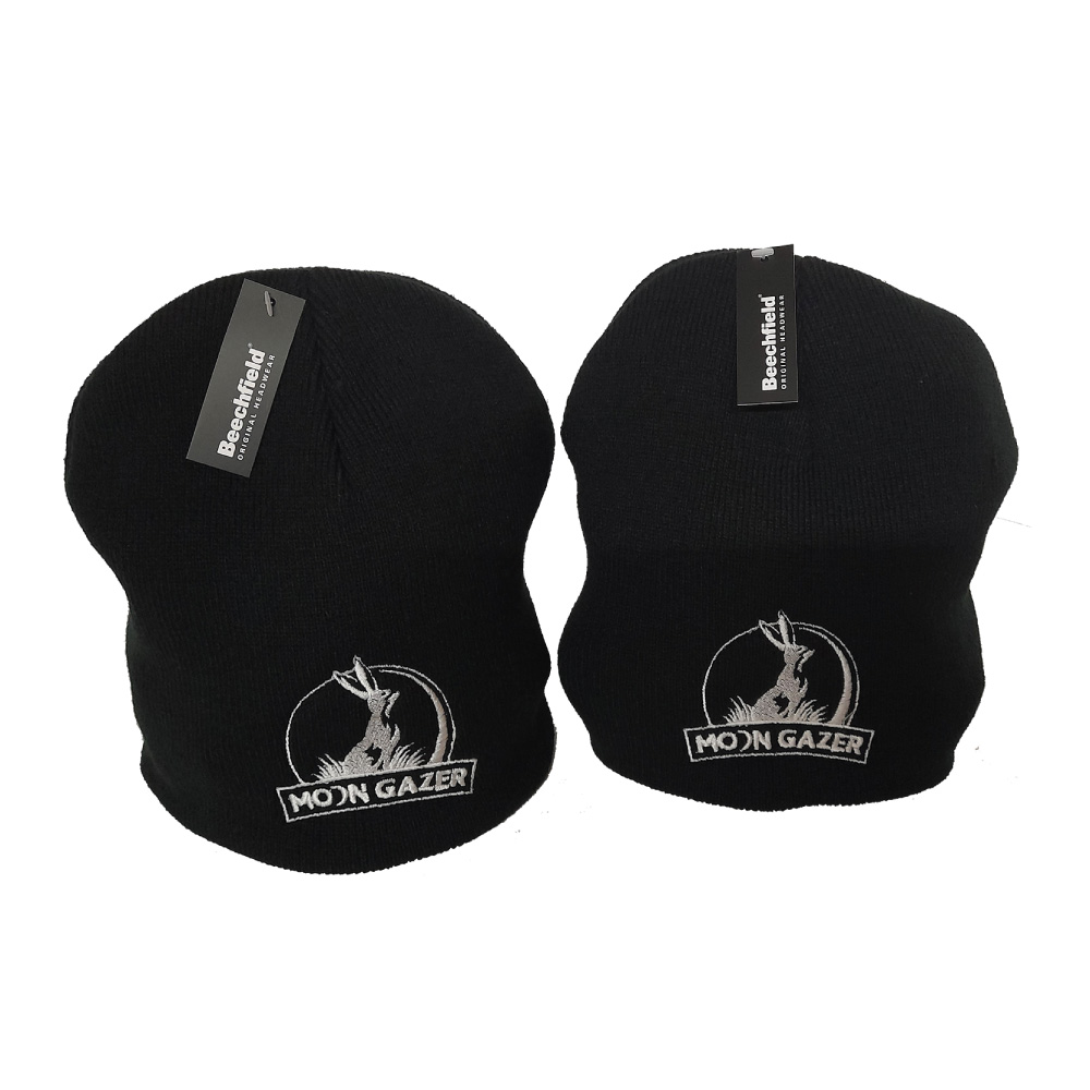 Moon Gazer beanie hat, black with white embroidered logo (one size)