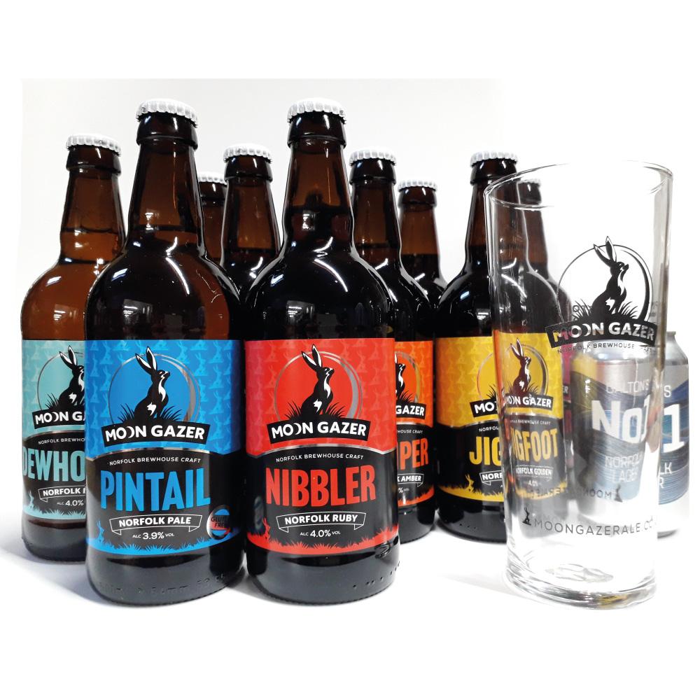 A mixed case of eleven different Moon Gazer bottles and cans with a pint glass. Case includes a mix of eleven bottles and cans with one pint glass. Bottles and cans may vary from those shown, dependent on stock and availability. If you have certain bottles or cans you would like included, let us know when you order!